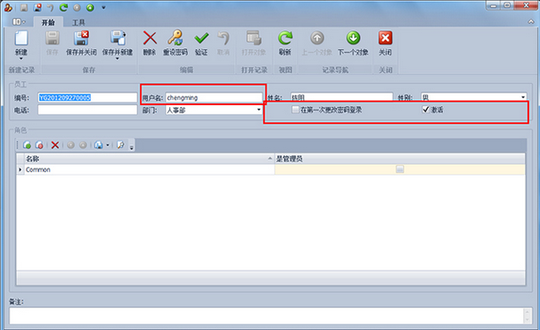 第2步、點擊工具欄的“新建”按鈕,彈出新建員工詳細界面,輸入員工姓名、用戶名(登錄賬號),密碼默認為空,如果選中“次登錄修改密碼”,則在次登錄的時候會顯示修改密碼對話框。選中“激活”表示員工能夠登錄系統(tǒng),否則員工不能登錄系統(tǒng)。