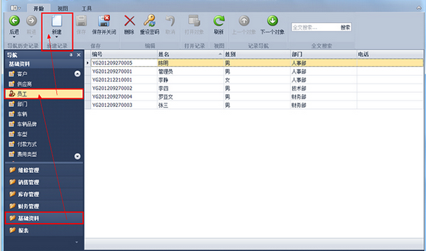 第1步、登錄傲藍汽車維修管理系統(tǒng),點擊“基礎資料”-“員工”,出現(xiàn)員工列表界面。
