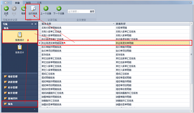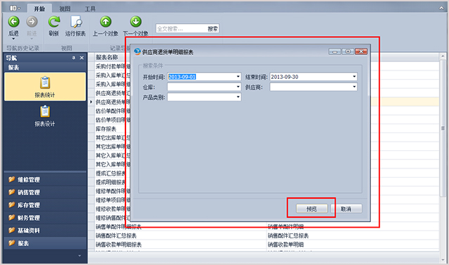 第2步、選中你想看的一個報表,然后點擊工具欄的“運行報表”,對于多數的報表都需要設定報表參數,如統計的開始時間和結束時間,此時軟件會自動彈出參數選定界面,如下圖。一般時間是需要選擇一個值的,而其它的一些參數,如倉庫、供應商等參數是可以不選擇的,這意味著報表將會統計所有的倉庫和供應商。選擇好參數后,點擊“預覽”來預覽報表。