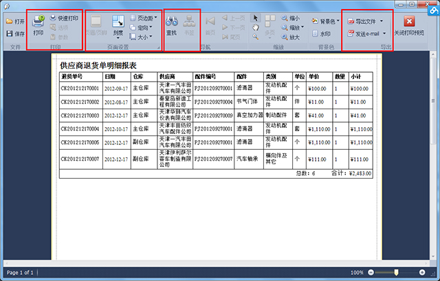 第4步、在報表預覽界面中可以打印報表、改變報表打印的紙張大小和方向、查找報表內容和導出報表為電子文檔。