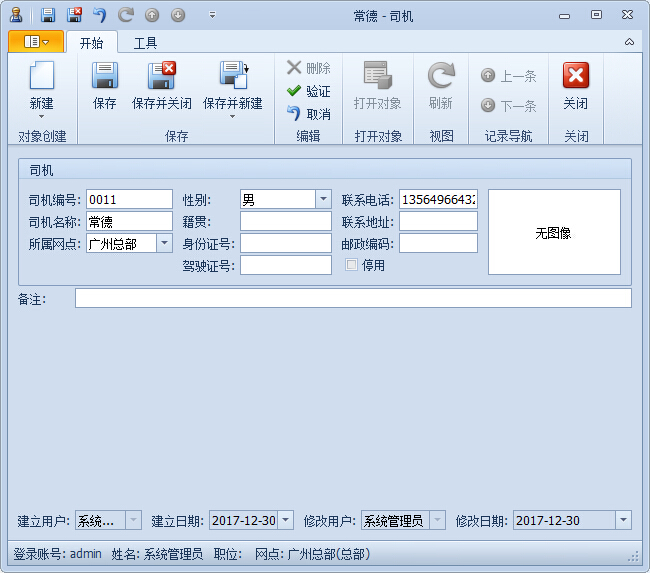 第2步、點擊工具欄的“新建”按鈕,彈出新建司機檔案詳細界面,輸入司機編號、名稱、所屬網點、身份證號、駕駛證號、相片等信息,保存即可完成司機檔案的添加。