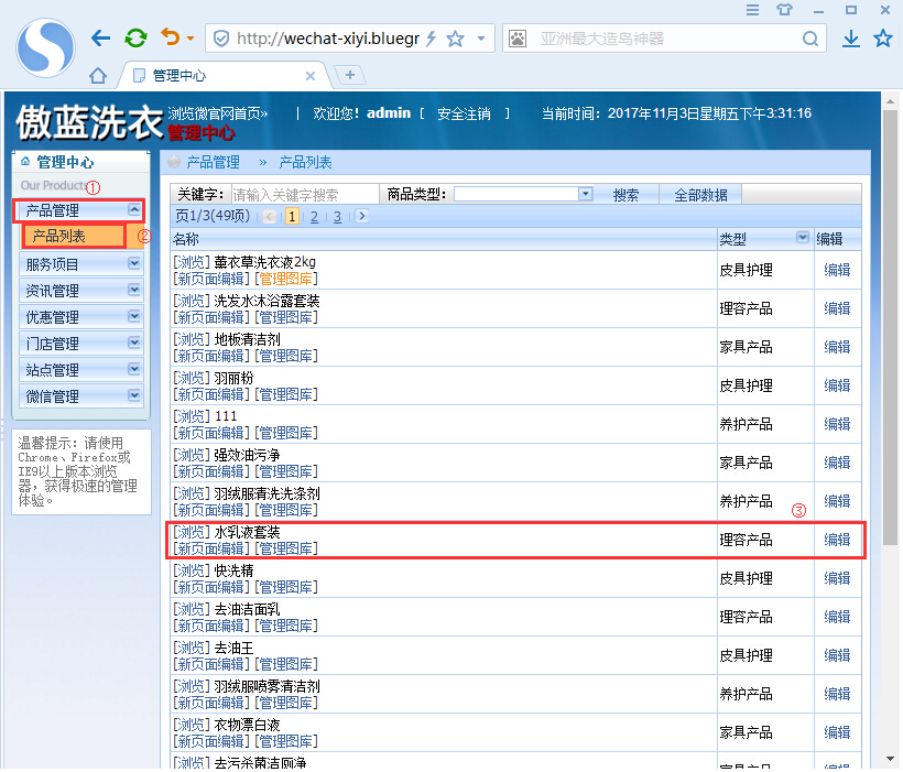 3、設置好在微商城上銷售的商品之后,就可以進入傲藍洗衣店軟件微信后臺管理,進行優化微商城產品展示,使得商品更具吸引力和提升會員購物體驗,增加會員的購買欲從而增加產品銷量。登錄至微信后臺管理,點擊【產品管理】→【產品列表】選中需要新添加商品進行優化,如圖: