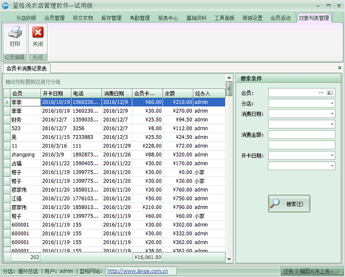 傲藍洗衣店會員管理軟件會員消費統計報表