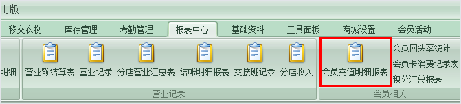 1、進入干洗店會員管理軟件點擊“報表中心”的會員充值明細報表。