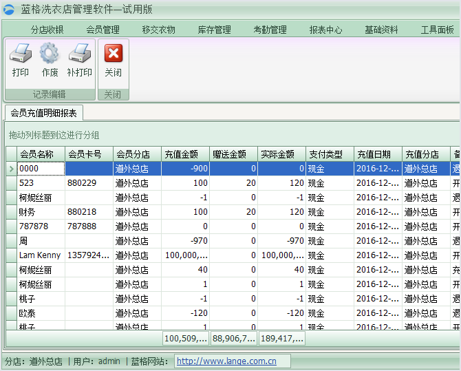 進入傲藍干洗店會員管理軟件點擊“報表中心”的會員充值明細報表,可以詳細的介紹充值的明細,分別顯示有:會員名稱,充值金額,實際金額,和充值的日期,店鋪等。