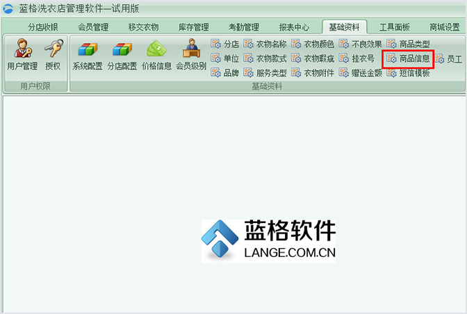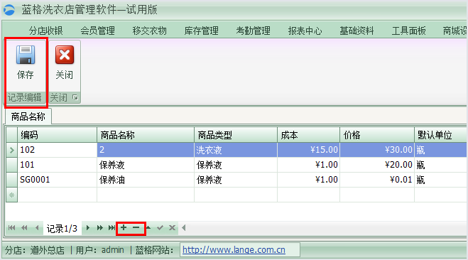 先點擊【基礎資料】-【商品信息】,在傲藍洗衣店管理系統彈出的商品管理的編輯界面中點擊【+】添加商品信息,【-】刪除當前選擇的商品,修改好之后點擊保存,保存當前修改的數據到數據庫。如圖: