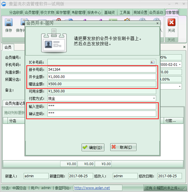 2、會員發卡,填寫完會員信息保存之后,系統會提醒給會員發卡,填寫會員卡號,發卡的同時還可以進行充值,填入充值金額,為保障會員卡的資金安全,軟件還支持給會員卡設置消費密碼,如圖: