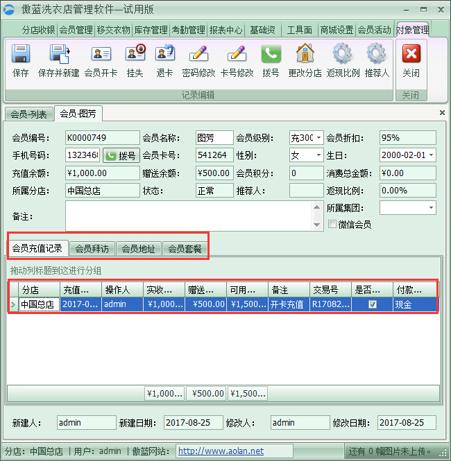 3、在會員詳細頁面,提供查看會員的歷史消費記錄、充值記錄,進行會員拜訪記錄登記,會員地址登記,方便會員需要上門收衣的時候,不用再次詢問登記會員地址,方便管理會員,如圖: