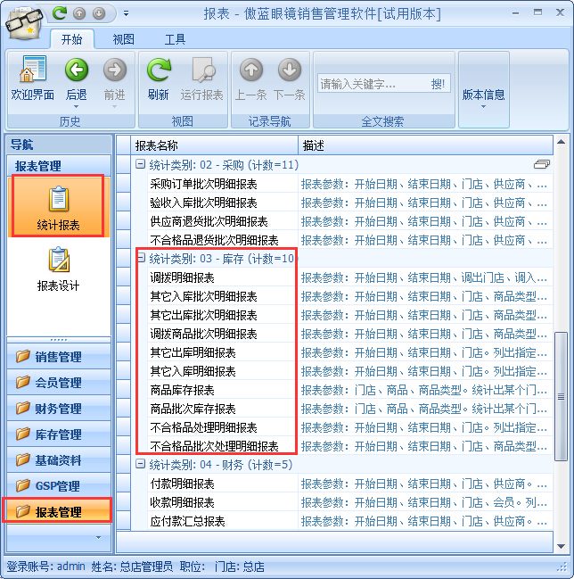 點擊眼鏡店管理軟件的【報表管理】→【統計報表】→找到“庫存”報表類型,有關于庫存變動情況的報表都集中在這里,