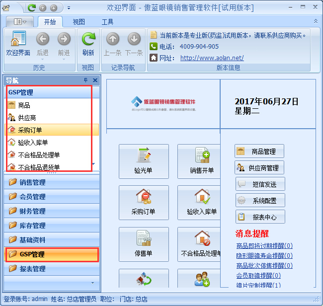 1、軟件上有專門協助門店管理隱形眼鏡的管理模塊,稱為“GSP管理”,GSP管理模塊可管理隱形眼鏡的商品、供應商、采購訂單、驗收入庫單、不合格品處理單、不合格品退貨單、盤點檢查、停售單等等。如圖: