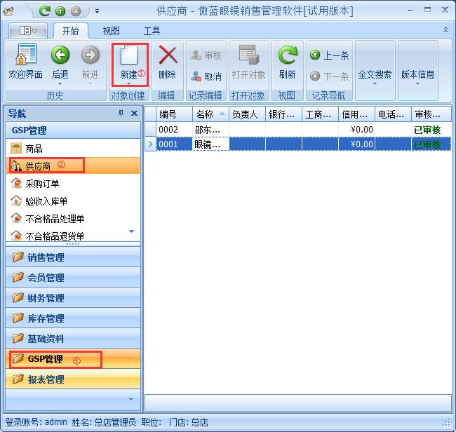 3、隱形眼鏡商品新建完成之后,必須對隱形眼鏡的供應商進行嚴格管理,首次合作的隱形眼鏡供應商還必須經過審核。那么在傲藍隱形眼鏡管理系統是如何做到對隱形眼鏡供應商進行管理與審核的呢?具體步驟如下: