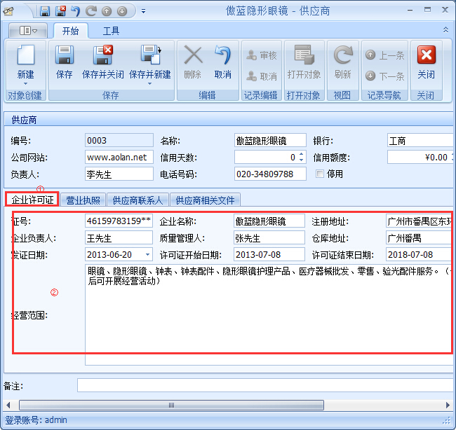 ②根據GSP要求,隱形眼鏡供應商只有電話、負責任等基礎的信息是不夠的,必須記錄企業許可證、營業執照等企業的詳細信息,方便了解到隱形眼鏡的詳細生產,企業許可證是隱形眼鏡供應商第三類醫療器械銷售許可證,以方便相關部門查閱檢查,因此必須一一記錄,如圖: