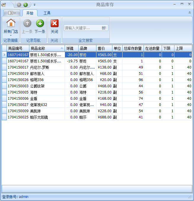 8、庫存下限提醒,傲藍眼鏡店銷售管理系統可以同時提醒庫存不足的商品,提醒門店管理人員盡快采購商品來補充庫存,如圖: