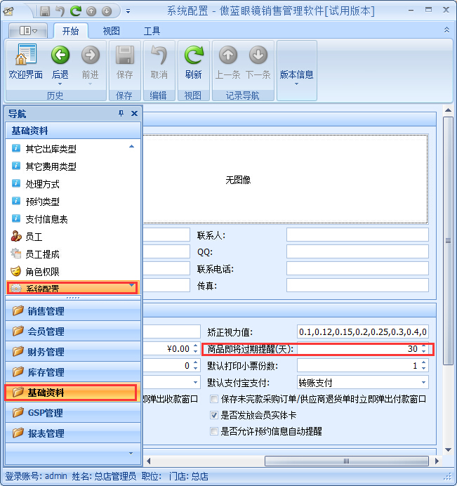 1、商品即將過期提醒,有助于提醒門店盡快處理即將過期的商品,減少損失,具體設置操作:【基礎資料】→【系統配置】“商品即將過期提醒(天)”設置即將過期的提醒天數,如提前一年或一個月提醒,如圖: