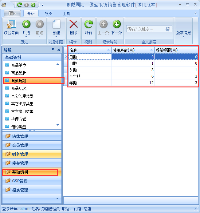 2、隱形眼鏡壽命提醒,根據食藥監局的規定傲藍眼鏡店銷售管理系統可根據隱形眼鏡的佩戴周期以及客戶購買的時間,智能提醒店員進行自動回訪客戶,讓客戶重新到店購買。隱形眼鏡佩戴周期設置,點擊【基礎資料】→【佩戴周期】進行設置隱形眼鏡的佩戴周期,如圖: