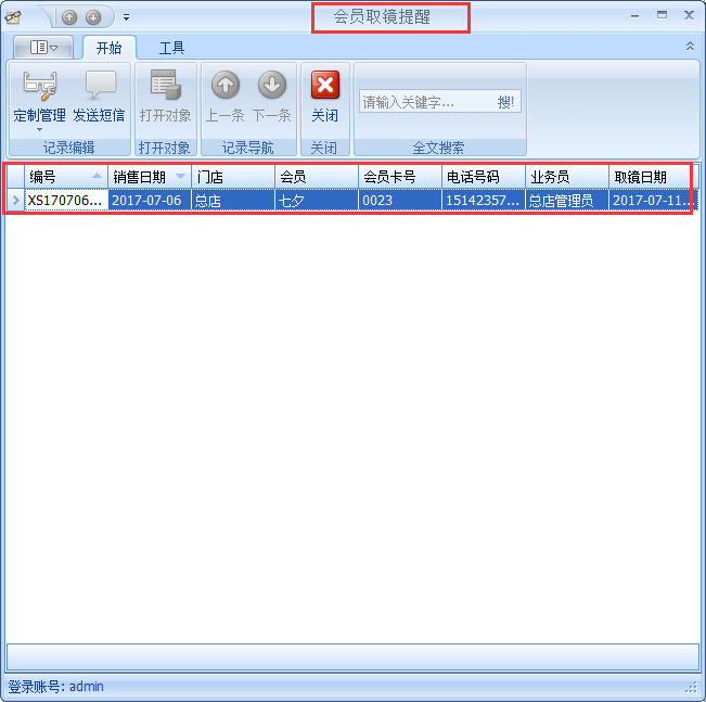 3、會員取鏡提醒,客戶的配鏡加工需要時間,軟件智能協助門店提醒今天可以到店取鏡的會員名單,主動提醒會員到店進行取鏡,提升門店整體形象,如圖: