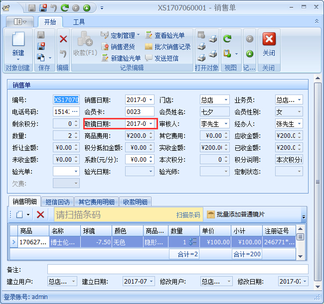 ①會員取鏡提醒操作:在為客戶開銷售單時,輸入取鏡時間,軟件就能自動提醒生成會員取鏡提醒單,如圖: