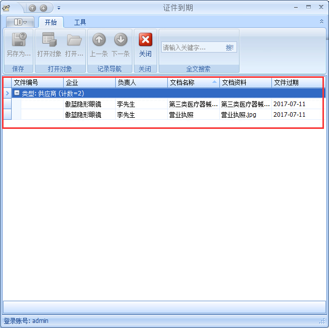 6、證件過期提醒,傲藍眼鏡店銷售管理系統智能提醒供應商的證件副本的有效期,及時聯系供應商索要新的證件,保證隱形眼鏡供應商都是合格企業,讓客戶消費更放心,如圖:
