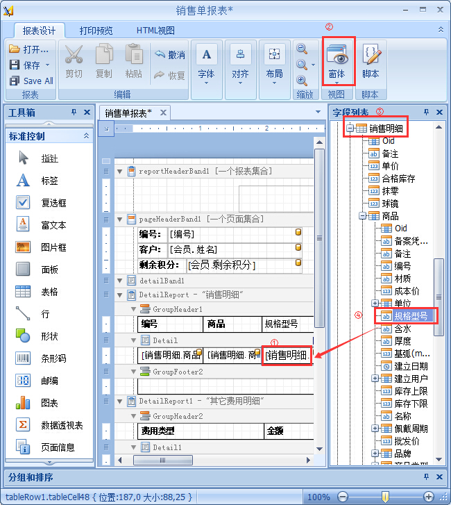傲藍眼鏡店銷售管理軟件銷售單明細報表設計-添加單據字段操作步驟如下: