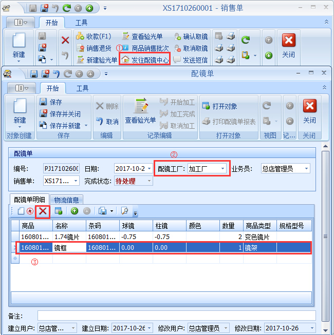 ①銷售單保存之后,點擊菜單欄上的“發往配鏡中心”將銷售單發到配鏡中心,形成配鏡單,選擇配鏡工廠,并在配鏡單明細中刪除鏡框明細,因為鏡框是從門店寄到配鏡中心裝配的,不需要使用配鏡中心的庫存,保存配鏡單即可,如圖: