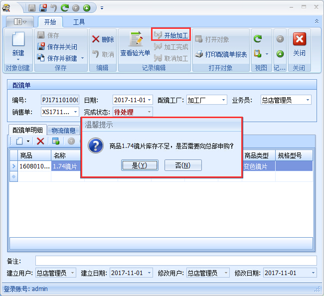 2、當配鏡中心接收到眼鏡店提交的配鏡單,配鏡中心工作人員在傲藍眼鏡店管理軟件的配鏡中心客戶端,點擊【銷售管理】→【配鏡單】,雙擊打開待處理的配鏡單,點擊菜單欄的“開始加工”,當配鏡工廠的鏡片庫存不足時,將會提示“庫存不足,是否需要向總部申購”,點擊“是”即可直接向總部提交申購單,如圖: