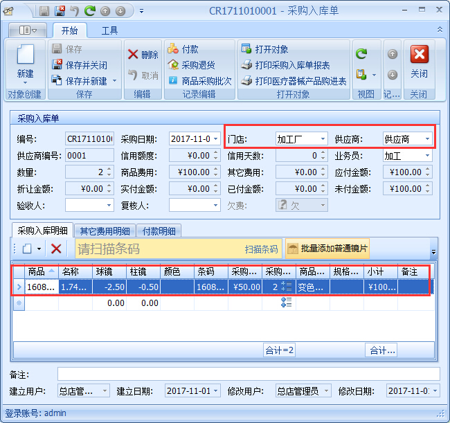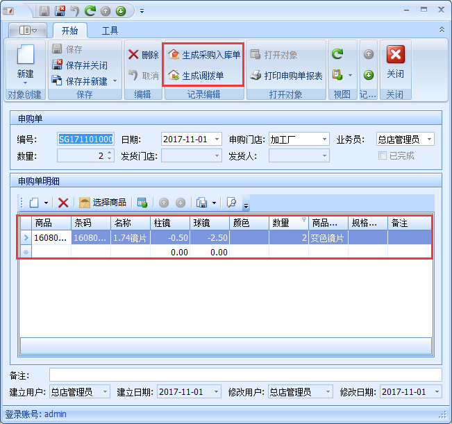 4、總部工作人員在申購單中,點擊“生成采購入庫單”將配鏡工廠申購的鏡片產品智能帶入采購入庫單中,在采購入庫單中填入申購的門店或配鏡工廠,供應商,保存采購單,商品采購完成直接發往配鏡工廠,增加配鏡工廠的鏡片庫存,如圖: