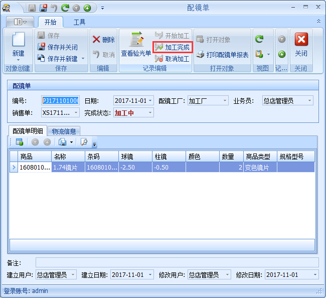 5、配鏡工廠接收到總部采購的鏡片產品,繼續進行鏡片加工,在【銷售管理】→【配鏡單】確認完成眼鏡店的加工定制,點擊“加工完成”,眼鏡定制加工狀態也能實時反應到門店軟件中,讓門店的工作人員實時查看配鏡進度,如圖: