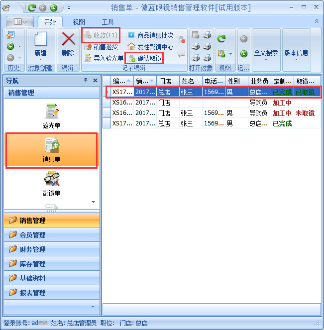 6、當配鏡中心眼鏡定制完成,門店的傲藍眼鏡店管理軟件實時接收配鏡進度,完成配鏡后軟件自動做出取鏡提醒,當會員上門取鏡時,工作人員打開銷售單進行收款,并點擊“確認取鏡”,整個門店銷售→配鏡中心定制眼鏡→配鏡中心申購→總部統一采購入庫→眼鏡定制訂單的流程就完成了,如圖: